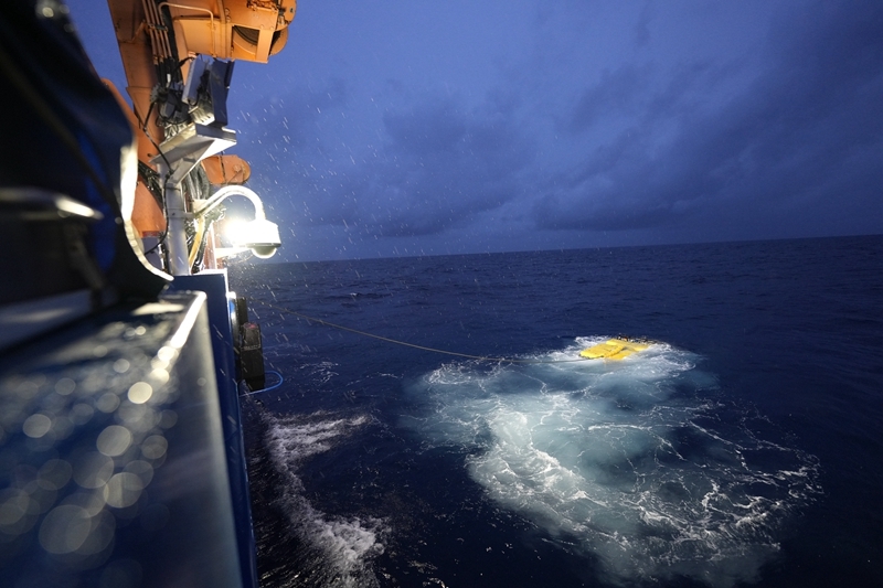 8月22日晚,考察隊員在“中山大學(xué)”號船艉主甲板冒雨布放“海琴”號。