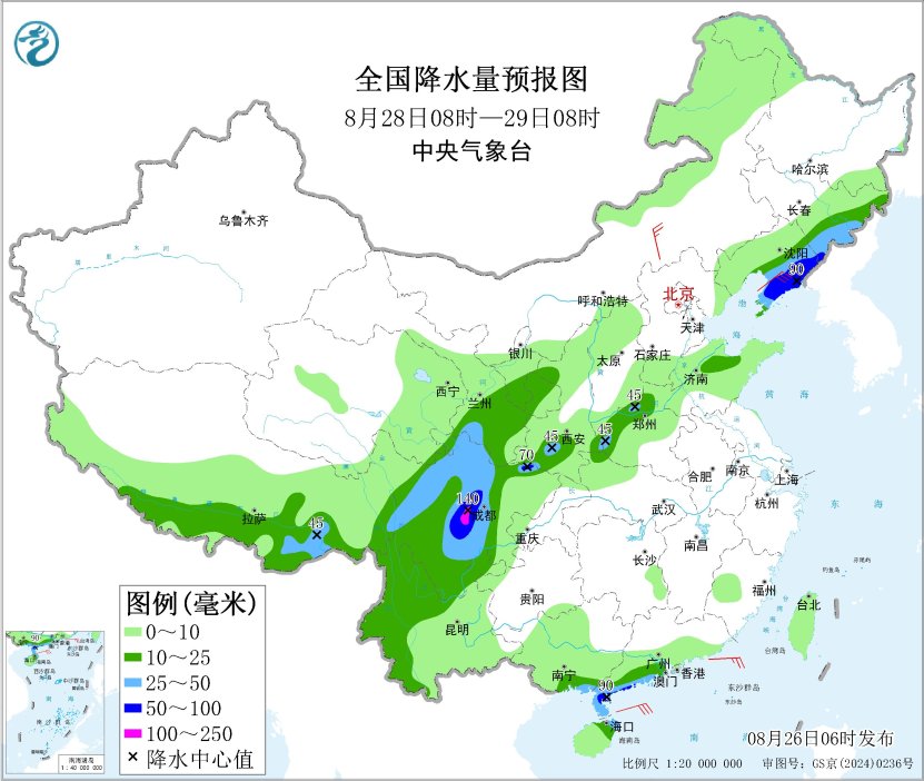 8月27日08時(shí)至28日08時(shí),內(nèi)蒙古中東部、遼寧中南部、青海東部和南部、甘肅南部、寧夏、陜西北部、山西中北部、京津冀、四川盆地西部、川西高原北部、云南南部、廣西西南部、海南島等地有中到大雨,其中,遼寧西南部、河北中北部、北京、天津、四川盆地西部、甘肅西南部等地的部分地區(qū)有暴雨或大暴雨(100~200毫米)。內(nèi)蒙古中部、遼東半島、山東半島等地的部分地區(qū)有4~5級(jí)風(fēng)。渤海有5~7級(jí)、陣風(fēng)8級(jí)的偏東風(fēng),南海東北部海域有6~7級(jí)、陣風(fēng)8級(jí)的偏東風(fēng),南海東南部海域有5~7級(jí)、陣風(fēng)8級(jí)的偏西風(fēng)。