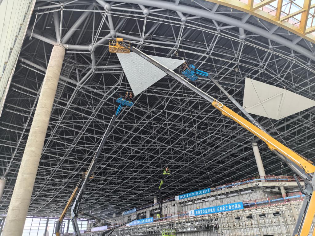 “咔嚓”,隨著兩塊蜂窩金屬鋁板精準(zhǔn)扣接,P6施工區(qū)的各吊頂模塊緊緊相扣,為“鳳凰”腹部覆蓋上精美堅固的“銀甲”。