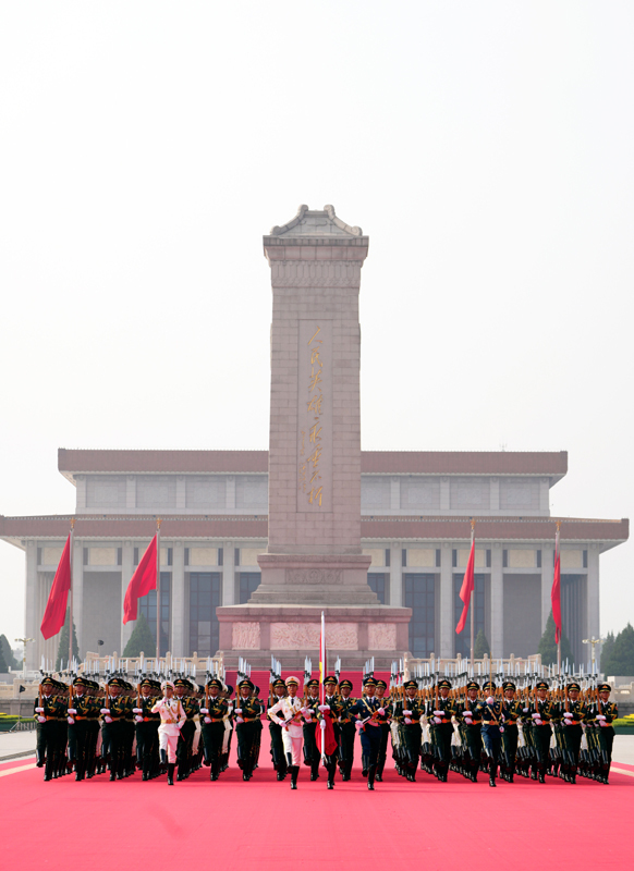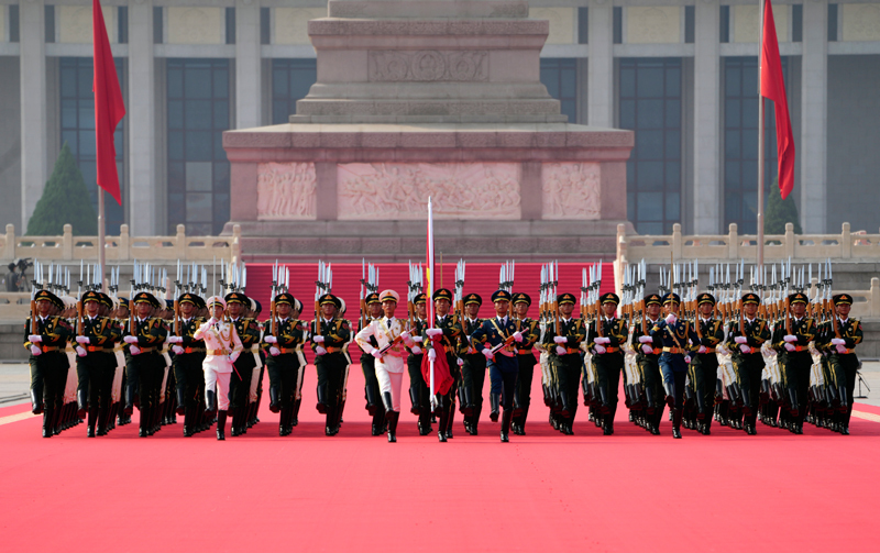 9月3日,紀(jì)念中國人民抗日戰(zhàn)爭暨世界反法西斯戰(zhàn)爭勝利80周年大會在北京隆重舉行。這是國旗護(hù)衛(wèi)隊(duì)從人民英雄紀(jì)念碑基座出發(fā),走向旗桿基座。