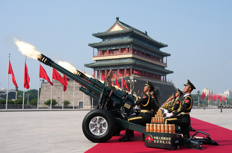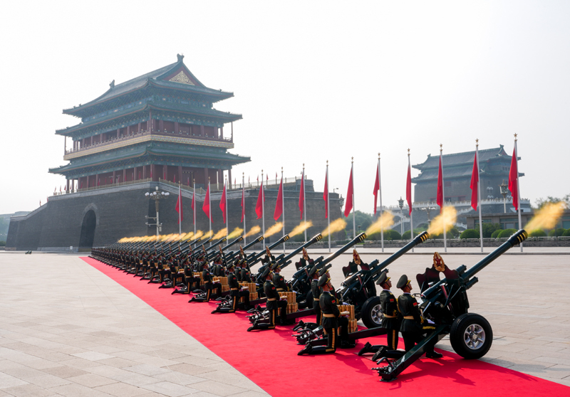 9月3日,紀(jì)念中國人民抗日戰(zhàn)爭暨世界反法西斯戰(zhàn)爭勝利80周年大會在北京天安門廣場隆重舉行。這是禮炮在天安門廣場鳴響。