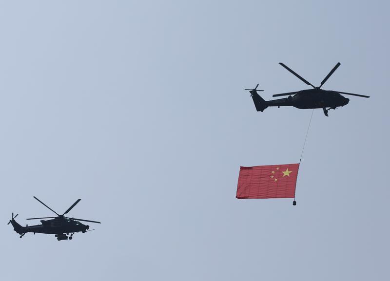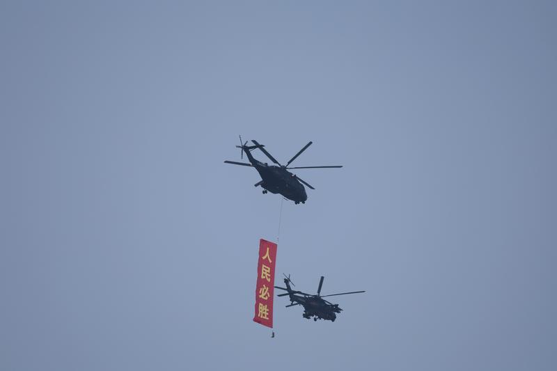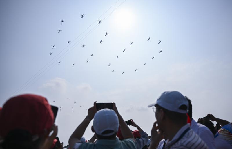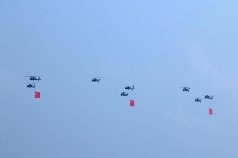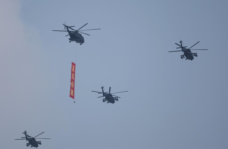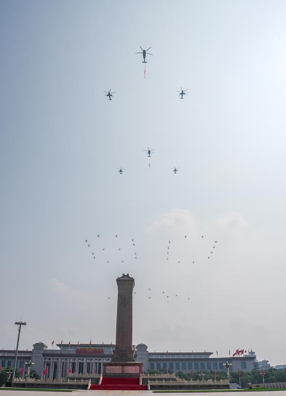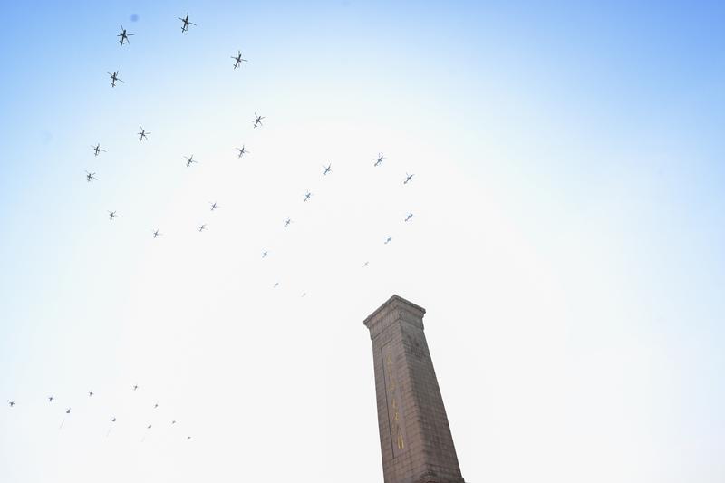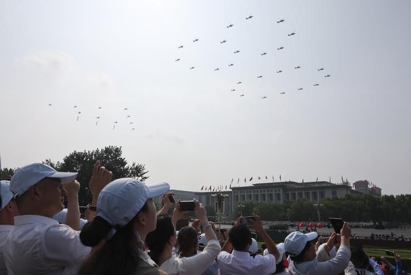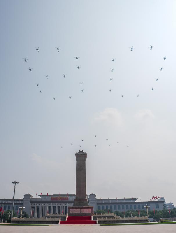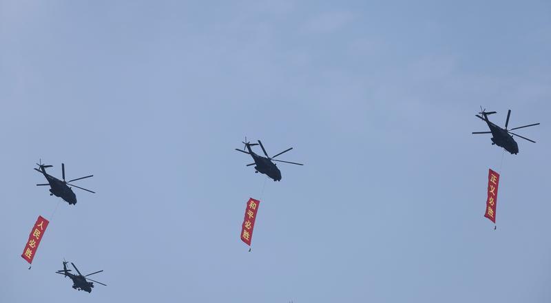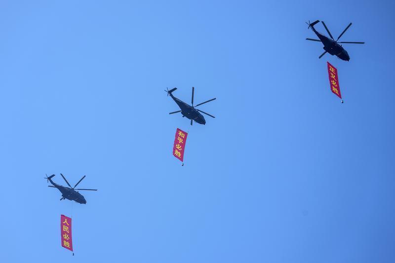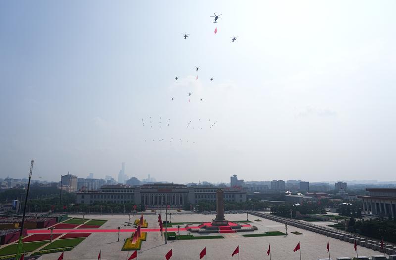 9月3日,紀(jì)念中國人民抗日戰(zhàn)爭暨世界反法西斯戰(zhàn)爭勝利80周年大會在北京隆重舉行。這是空中護(hù)旗梯隊(duì)飛過天安門廣場上空,26架直升機(jī)匯成巨大的“80”字樣。