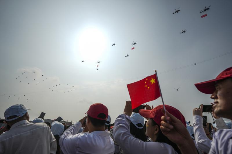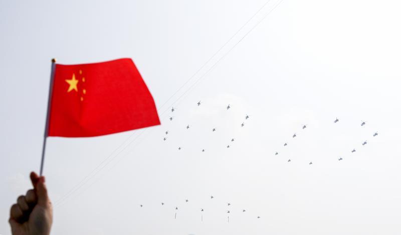 9月3日,紀(jì)念中國人民抗日戰(zhàn)爭暨世界反法西斯戰(zhàn)爭勝利80周年大會在北京隆重舉行。這是空中護(hù)旗梯隊(duì)。