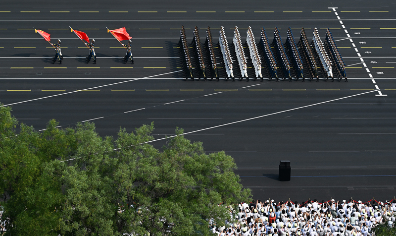 9月3日,紀(jì)念中國人民抗日戰(zhàn)爭暨世界反法西斯戰(zhàn)爭勝利80周年大會在北京隆重舉行。這是國旗護(hù)衛(wèi)隊在天安門廣場列隊。