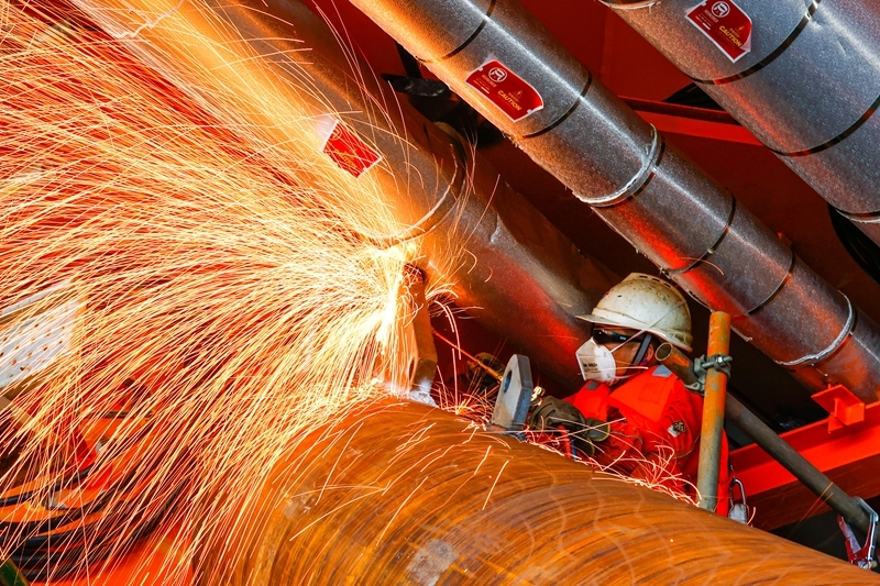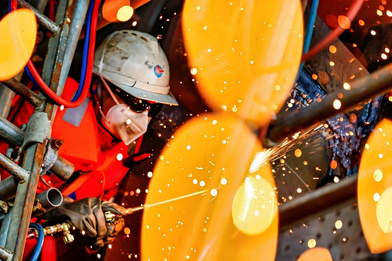 9月8日,工人在墾利6-1油田10-1北區(qū)塊Ⅱ期開發(fā)項(xiàng)目油氣平臺(tái)安裝作業(yè)現(xiàn)場進(jìn)行切割作業(yè)。