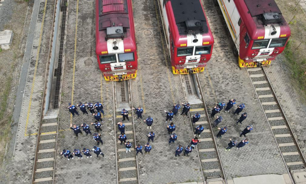 2025年8月19日,在肯尼亞內(nèi)羅畢非洲之星鐵路運營有限責任公司機務運轉整備場,中肯兩國鐵路工作者在機車前站列并組成“3000”字樣,以紀念蒙內(nèi)鐵路實現(xiàn)安全運營3000天(無人機照片)。新華社記者 楊光 攝
