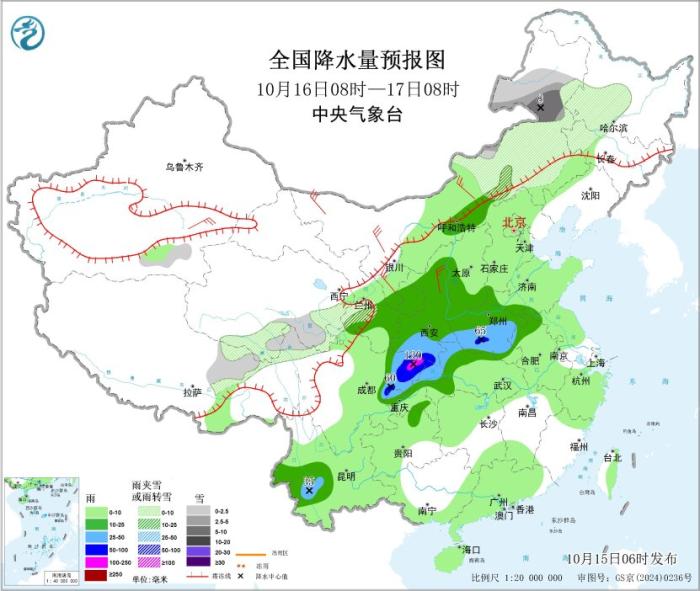 10月16日08時至17日08時,內(nèi)蒙古東部、黑龍江西部、吉林西部、甘肅西南部、青海東部和南部、西藏東北部等地部分地區(qū)有小到中雪或雨夾雪,內(nèi)蒙古東北部等地部分地區(qū)有大雪;四川盆地東部、西北地區(qū)東部、黃淮西部、江漢西部和北部、云南西南部等地部分地區(qū)有中到大雨,其中,陜西南部、四川東北部、重慶西北部、河南西南部等地部分地區(qū)有暴雨或大暴雨(100~120毫米)。新疆南疆盆地、內(nèi)蒙古中西部、西北地區(qū)東部等地部分地區(qū)有4~6級風(fēng)。
