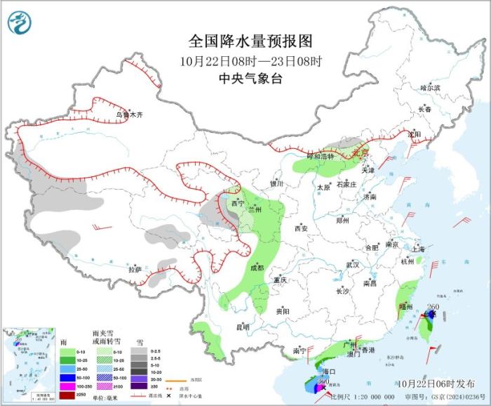 10月22日8時至23日8時,新疆南疆盆地和西部山區(qū)、西藏西部和東部、青海東部和南部、甘肅西南部、河北北部等地部分地區(qū)有小到中雪或雨夾雪;海南島、臺灣島北部、廣東雷州半島等地部分地區(qū)有大到暴雨,其中,海南島東南部、臺灣島北部等地部分地區(qū)有大暴雨,局地特大暴雨(250~260毫米)。新疆北部和東部、西藏中北部、青海西南部、甘肅西部、遼東半島、山東半島、福建東部、廣東南部、廣西南部、海南島等地部分地區(qū)有5~6級風(fēng),陣風(fēng)7~8級;黃海南部海域、東海北部海域、北部灣、瓊州海峽將有7~8級、陣風(fēng)9~10級的大風(fēng),東海南部海域、臺灣海峽、臺灣以東洋面、巴士海峽、南海北部和中西部海域?qū)⒂?~10級、陣風(fēng)11~12級的大風(fēng)。