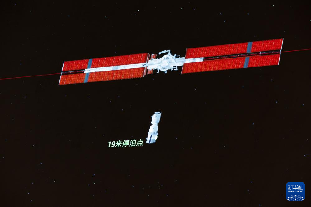 4月24日在北京航天飛行控制中心拍攝的神舟二十號(hào)載人飛船成功對(duì)接空間站天和核心艙的模擬畫(huà)面。新華社記者 金立旺 攝