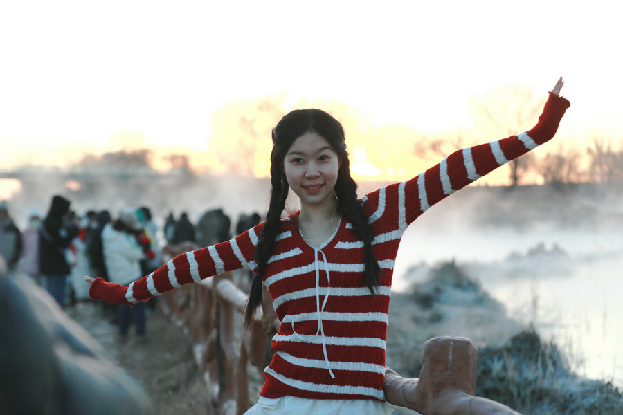 12月15日清晨,上千名游人在呼和浩特玉泉區(qū)班定營村南側(cè)的塞外“千島湖”畔賞景打卡。此處湖水為城市污水經(jīng)處理達(dá)標(biāo)后的再生水,隆冬時(shí)節(jié),再生水流入湖中,水汽蒸騰,岸邊草木霧凇皚皚,良好的生態(tài)吸引了數(shù)萬只赤麻鴨在此翔集棲息,構(gòu)成一幅生動(dòng)和諧的美麗畫面。每日清晨,都有上千名游客來此觀日出賞美景。