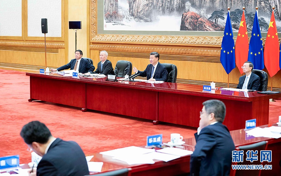9月14日晚,國家主席習近平在北京同歐盟輪值主席國德國總理默克爾、歐洲理事會主席米歇爾、歐盟委員會主席馮德萊恩共同舉行會晤,會晤以視頻方式舉行。新華社記者龐興雷攝