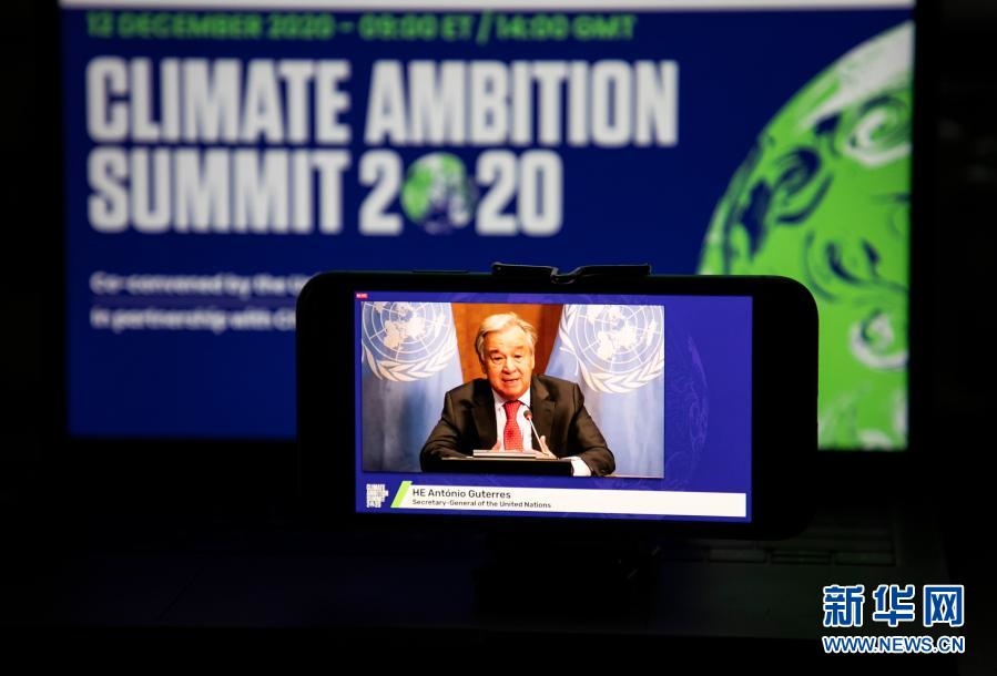 這是2020年12月12日在美國紐約拍攝的聯(lián)合國秘書長古特雷斯在氣候雄心峰會上通過視頻發(fā)表講話的屏幕畫面。氣候雄心峰會由聯(lián)合國及有關(guān)國家倡議舉辦,旨在紀念《巴黎協(xié)定》達成五周年,進一步動員國際社會強化氣候行動,推進多邊進程。新華社記者