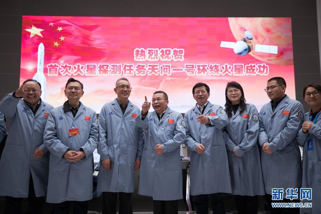 2021年2月10日,在北京航天飛行控制中心指揮大廳,航天科研人員慶祝我國(guó)首次火星探測(cè)任務(wù)天問一號(hào)環(huán)繞火星成功。新華社記者 金立旺 攝
