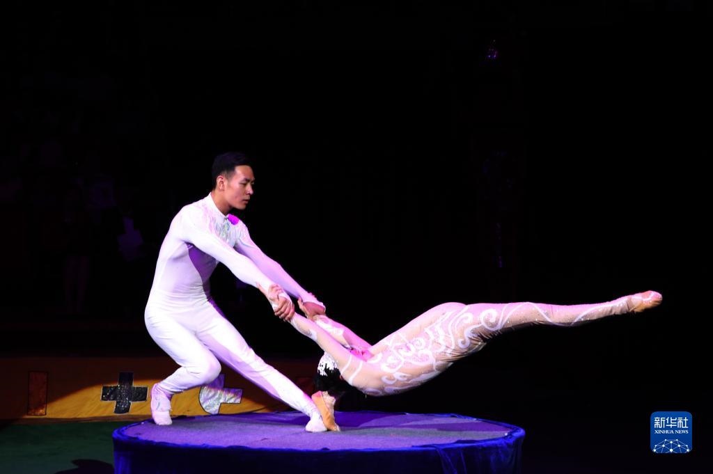 2019年9月4日,在蒙古國首都烏蘭巴托,中國河北省滄州市雜技團(tuán)演員表演雜技。新華社發(fā)(蘇力雅/攝)