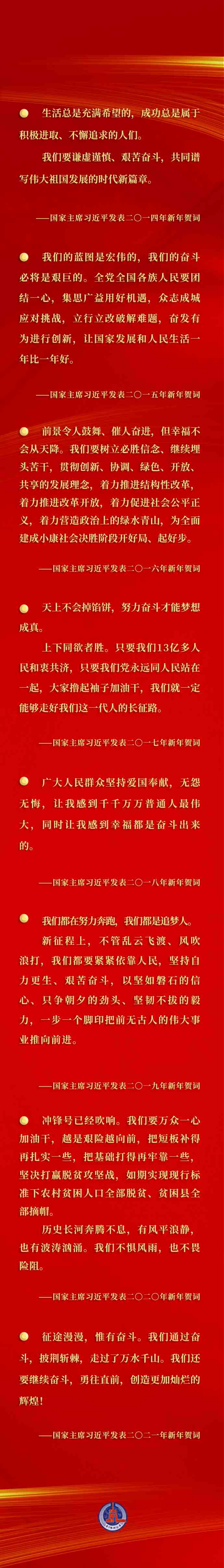每年的新年賀詞,都在激勵(lì)我們乘勢(shì)而上、接續(xù)奮斗,匯聚激勵(lì)各族人民團(tuán)結(jié)一心、并肩奮斗的強(qiáng)大合力。