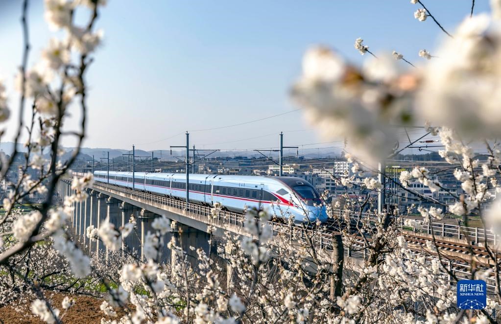 動(dòng)車(chē)組列車(chē)在成貴高鐵貴州黔西段行駛(2022年3月7日攝)。 新華社發(fā)(范暉 攝)