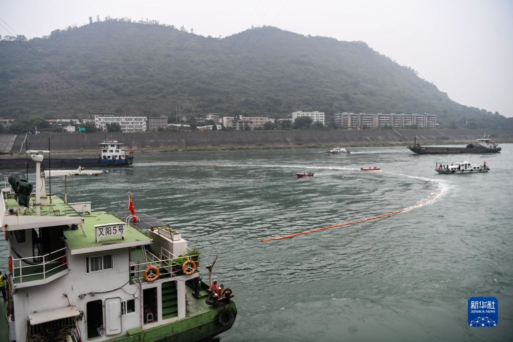 11月9日,在四川省宜賓市敘州區(qū)的長江流域突發(fā)生態(tài)環(huán)境事件應急綜合演練現(xiàn)場,多方部門協(xié)作在金沙江面布設圍油欄。新華社記者 王曦 攝