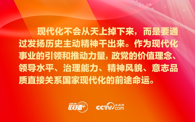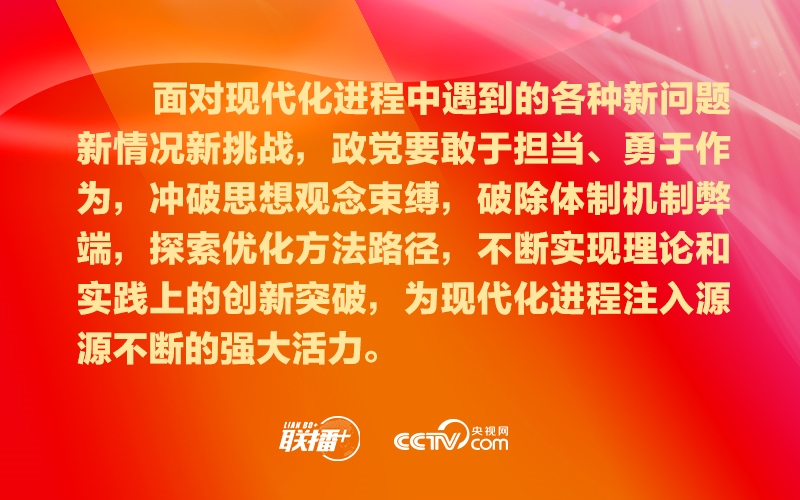 政黨要把自身建設(shè)和國(guó)家現(xiàn)代化建設(shè)緊密結(jié)合起來(lái),踔厲奮發(fā),勇毅篤行,超越自我,確保始終有信心、有意志、有能力應(yīng)對(duì)好時(shí)代挑戰(zhàn)、回答好時(shí)代命題、呼應(yīng)好人民期盼,為不斷推進(jìn)現(xiàn)代化進(jìn)程引領(lǐng)方向、凝聚力量。