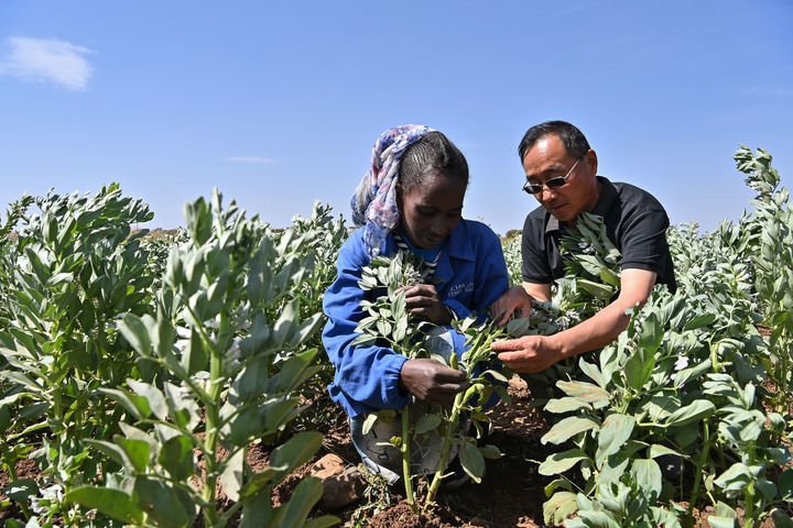 2023年9月27日,在位于厄立特里亞阿斯馬拉的農(nóng)業(yè)技術(shù)援助項(xiàng)目示范地,中國援厄第三期高級(jí)農(nóng)業(yè)專家組豆類作物專家劉運(yùn)民(右)指導(dǎo)當(dāng)?shù)剞r(nóng)戶進(jìn)行蠶豆作物的田間管理。新華社記者 韓旭 攝