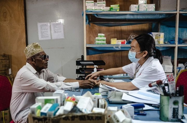 2024年1月11日,中國第15批援科摩羅醫(yī)療隊(duì)隊(duì)長潘春熹在位于科摩羅首都莫羅尼的馬魯夫醫(yī)院內(nèi)為患者看病。新華社記者 王冠森 攝