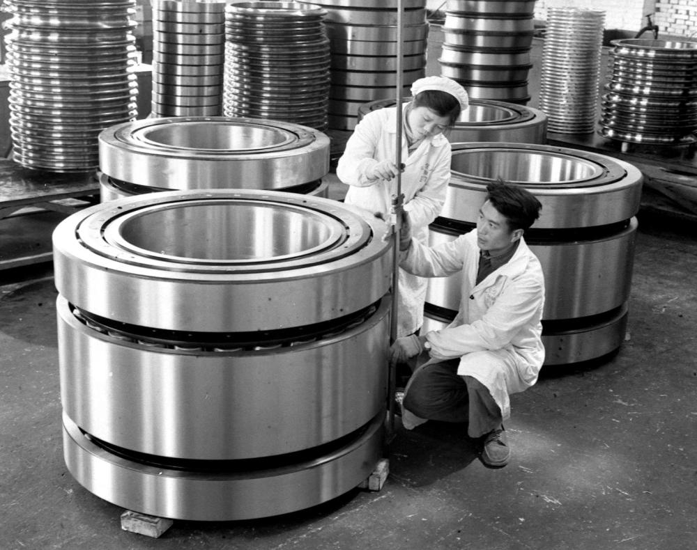1966年,洛陽(yáng)軸承廠檢驗(yàn)員在細(xì)心檢查即將出廠的一批特大型軸承的質(zhì)量。