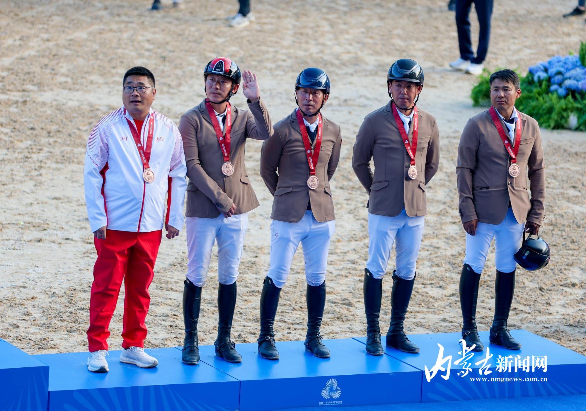 11月17日,第十五屆全國(guó)運(yùn)動(dòng)會(huì)馬術(shù)項(xiàng)目場(chǎng)地障礙團(tuán)體賽在深圳市光明國(guó)際馬術(shù)中心進(jìn)行,由達(dá)日瑪、劉同晏、張睿、韓豐組成的內(nèi)蒙古隊(duì)?wèi){借兩輪穩(wěn)定發(fā)揮,以總罰分31分的成績(jī)斬獲銅牌。
