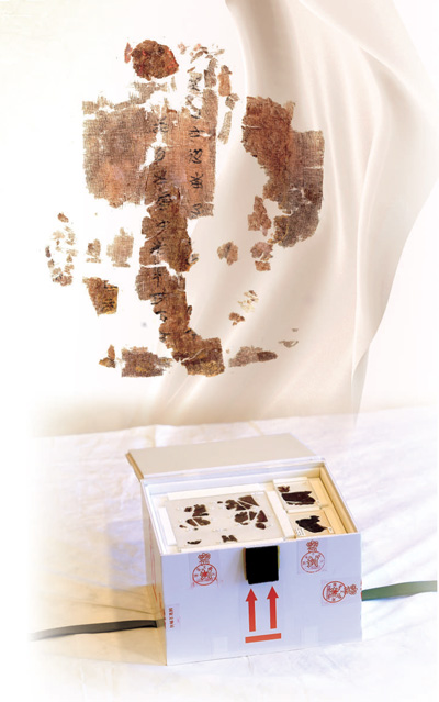 工作人員小心翼翼地打開文物包裝箱,《五行令》《攻守占》露出真容,深褐色的殘片被保存在有機玻璃里。盡管歷經(jīng)2000余年,但帛書上的殘留文字依稀可辨。