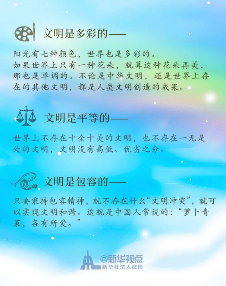 在這次演講中,習(xí)近平主席用生動(dòng)的語言講明了對待不同文明應(yīng)有的態(tài)度和原則: