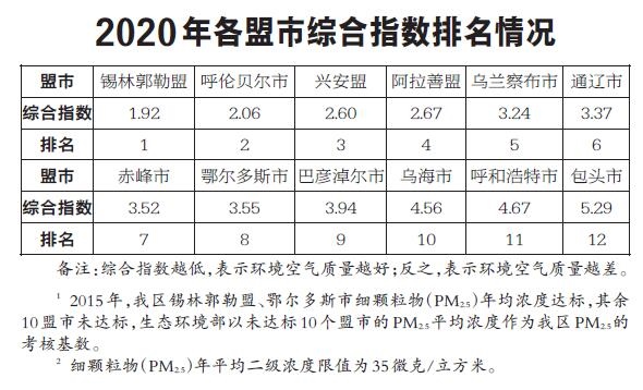 2020年1—12月,全區(qū)環(huán)境空氣質(zhì)量?jī)?yōu)良天數(shù)比例平均為90.8%。12個(gè)盟市優(yōu)良天數(shù)比例由高至低依次為:呼倫貝爾市(100.0%)、錫林郭勒盟(98.9%)、興安盟(97.0%)、赤峰市(95.1%)、阿拉善盟(94.8%)、烏蘭察布市(94.8%)、通遼市(91.0%)、鄂爾多斯市(90.7%)、巴彥淖爾市(84.1%)、烏海市(83.1%)、呼和浩特市(80.3%)和包頭市(79.5%)。