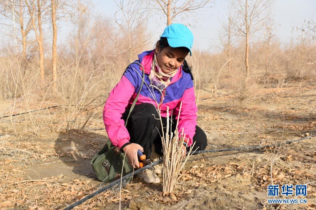 新疆且末縣河?xùn)|治沙站員工帕提古麗·亞森在檢查梭梭林滴灌帶(4月1日攝)。新華社記者 高晗 攝