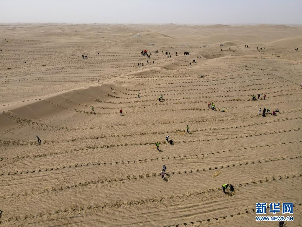 人們在距離新疆且末縣城不遠(yuǎn)處的塔克拉瑪干沙漠內(nèi)植樹(3月28日攝,無人機照片)。新華社記者 高晗 攝