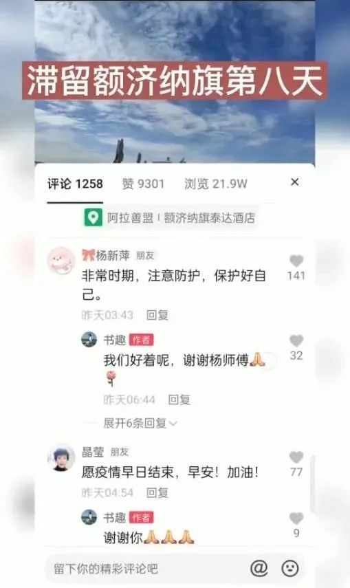 視頻發(fā)出數(shù)小時就吸引了上萬的瀏覽量。視頻發(fā)布者王女士在視頻中呈現(xiàn)一家人滯留額濟納旗現(xiàn)況的同時,也給和她同樣滯留額濟納旗的近萬名游客鼓勁:“如果你此時正在阿拉善,愿你如胡楊般堅強,積極應(yīng)對疫情?!?/p>