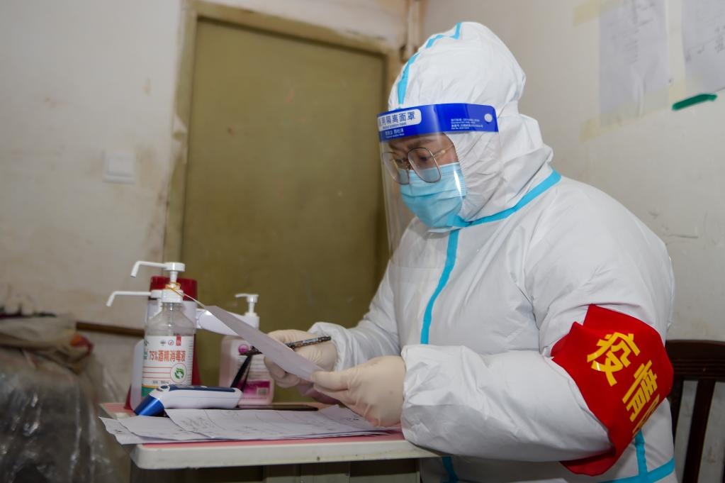 12月7日,在滿洲里市現(xiàn)代花園小區(qū),志愿者王力豐在核對(duì)居民信息。新華社記者李志鵬 攝