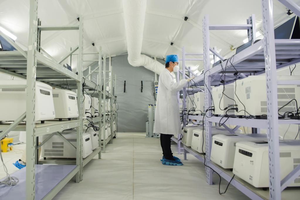 12月3日,工作人員在“獵鷹號(hào)”硬氣膜實(shí)驗(yàn)室進(jìn)行核酸檢測(cè)。新華社記者達(dá)日罕 攝