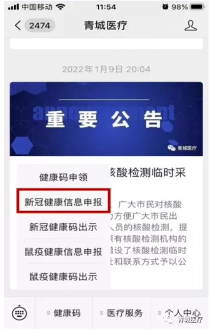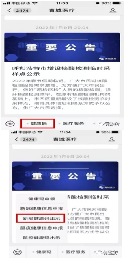 打開(kāi)青城醫(yī)療微信公眾號(hào),點(diǎn)擊“健康碼”選擇“新冠健康碼出示”。