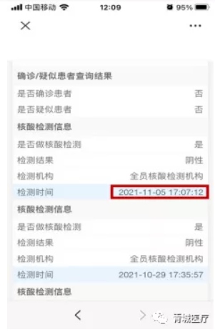 市民7天內(nèi)所做的核酸檢測(cè)結(jié)果會(huì)在健康碼綠碼下方顯示,7天之后信息會(huì)轉(zhuǎn)到綠碼下方的“個(gè)人健康風(fēng)險(xiǎn)評(píng)估(初步流調(diào))表”中,點(diǎn)擊后可查看最近3次的核酸檢測(cè)結(jié)果。核酸檢測(cè)結(jié)果具體到日期和具體時(shí)點(diǎn)。