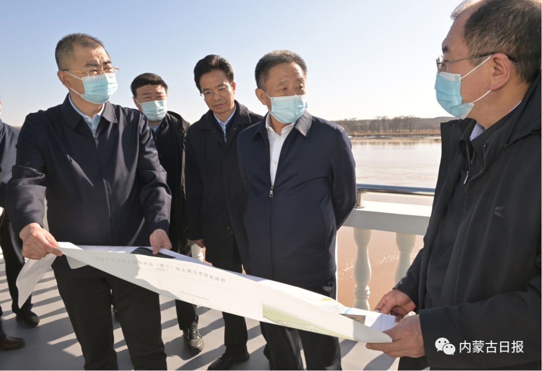3月25日上午,自治區(qū)黨委書記孫紹騁在鄂爾多斯市準(zhǔn)格爾旗龍口鎮(zhèn)大口村調(diào)研蒙晉陜?nèi)〗唤缣廃S河流出內(nèi)蒙古段生態(tài)保護(hù)情況。內(nèi)蒙古日報(bào)社融媒體記者 馬建荃 攝