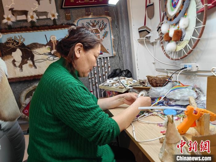 2月21日,在內(nèi)蒙古呼倫貝爾市鄂溫克族自治旗一家手工藝品工作室內(nèi),烏仁在制作太陽花手工藝品。 于嘉 攝