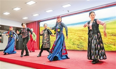 11月12日,烏蘭牧騎隊員在北京市西城區(qū)德勝街道辦事處與群眾一同跳舞。當日,內蒙古自治區(qū)直屬烏蘭牧騎攜包頭市達茂旗烏蘭牧騎、鄂爾多斯市伊金霍洛旗烏蘭牧騎開展“紅色文藝輕騎兵 烏蘭牧騎在北京”——北疆文化神州行文藝演出活動。據了解,此次烏蘭牧騎進京演出活動,從11月6日至17日,在北京的民族文化宮為觀眾奉獻33場精彩的演出,同時還將走進社區(qū)和學校開展多場演出活動。 (記者 王磊 攝)