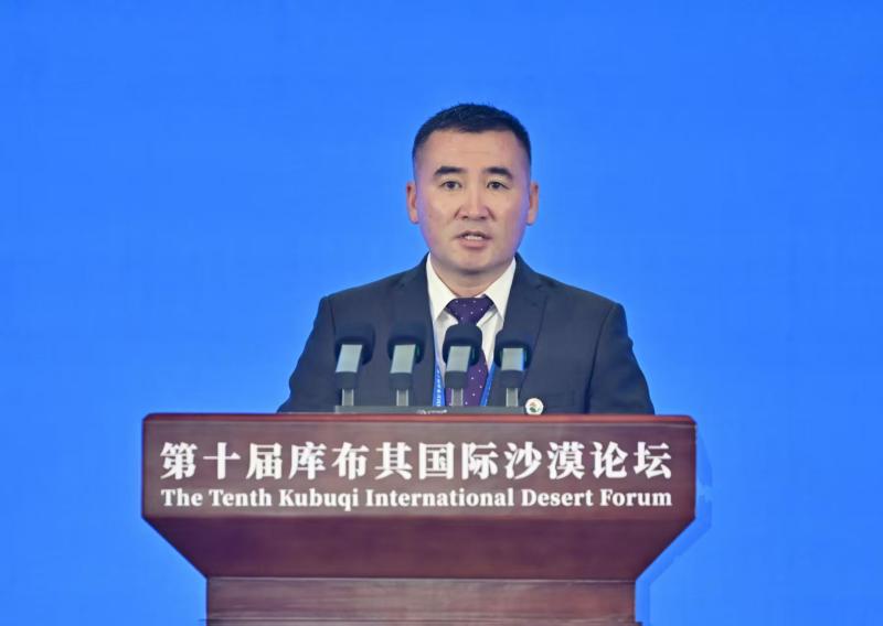 9月16日,蒙古國政府直屬國家林業(yè)局局長賓·奧云薩那在第十屆庫布其國際沙漠論壇開幕式上致辭。草原云·內(nèi)蒙古新聞網(wǎng)記者 馬建兵 攝