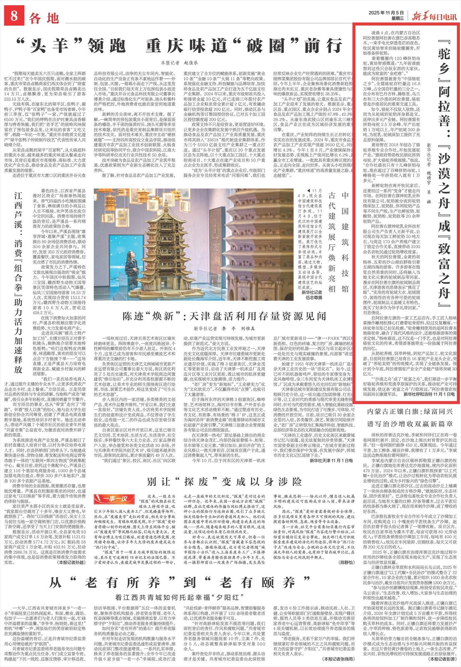 2025年11月5日,《新華每日電訊》第8版刊發(fā)題為《“駝鄉(xiāng)”阿拉善:“沙漠之舟”成“致富之舟”》的文章,報道了阿拉善盟被譽為“中國駱駝之鄉(xiāng)”,駱駝存欄量達(dá)16.8萬峰,占全國存欄量的三分之一。預(yù)計到今年底,阿拉善盟駝產(chǎn)業(yè)全產(chǎn)業(yè)鏈產(chǎn)值將突破30億元。