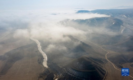 當(dāng)日,寧夏吳忠市同心縣的山谷間出現(xiàn)云海景觀,農(nóng)田、旱塬、公路在霧中若隱若現(xiàn),景色壯美。
