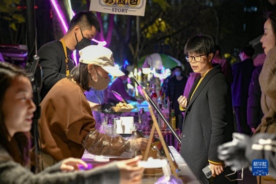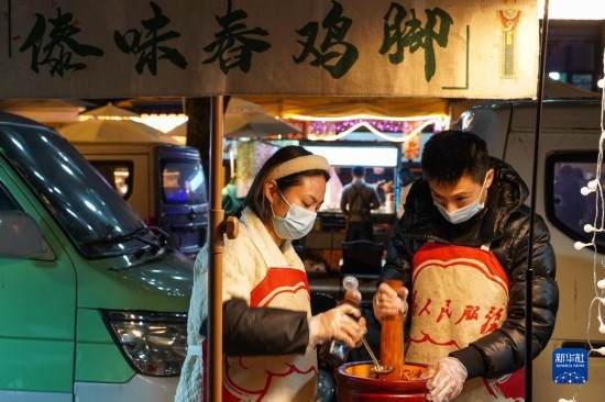 在四川省成都市錦江區(qū)三色路夜市,市民在購(gòu)買小吃(2月28日攝)。
