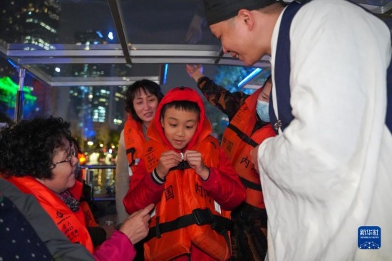 在四川省成都市“夜游錦江”游覽河段,工作人員在游船上與乘客互動(dòng)(3月1日攝)。