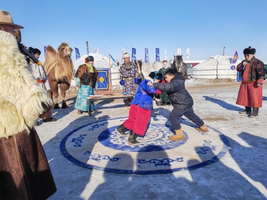 為迎接“十四冬”,呼倫貝爾推出了豐富多彩的文化活動(dòng)和產(chǎn)品。陳巴爾虎旗的牧民巴圖蘇和與合伙人在莫爾格勒河景區(qū)推出“天天冰雪那達(dá)慕”活動(dòng),設(shè)雪地搏克、騎馬射箭、“冰地嘎拉哈”、駱駝爬犁等項(xiàng)目,讓游客沉浸式體驗(yàn)蒙古族文化與傳統(tǒng)運(yùn)動(dòng)。首次嘗試雪地搏克的河北固安游客張瑞堂,與一位蒙古族少年友好競技,他的姐姐則用手機(jī)記錄下了這段珍貴的經(jīng)歷。