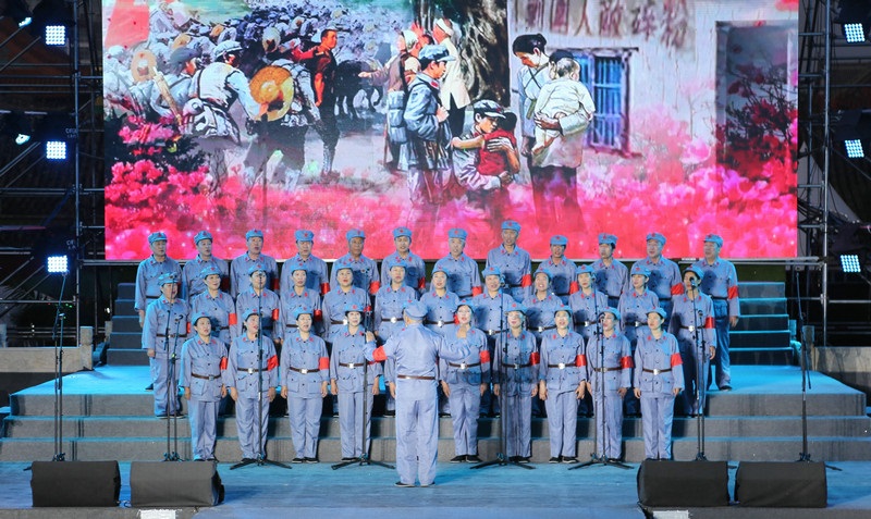 “唱支山歌給黨聽(tīng),我把黨來(lái)比母親,母親只生了我的身,黨的光輝照我心......”雨后的舞臺(tái)煥然一新,一首首耳熟能詳?shù)母锩枨讶藗兊乃季w瞬間拉回歷史的長(zhǎng)河,手中揮舞著一面面鮮艷的五星紅旗,點(diǎn)亮了整個(gè)夜晚。