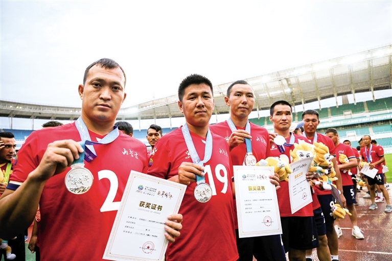 7月26日,內(nèi)蒙古隊(duì)球員展示銀牌。當(dāng)日,第十四屆全國運(yùn)動(dòng)會群眾比賽足球項(xiàng)目十一人制男子農(nóng)村鄉(xiāng)鎮(zhèn)組決賽在大雨中開戰(zhàn)。最終經(jīng)過90分鐘的爭奪,代表內(nèi)蒙古出戰(zhàn)的錫尼河鎮(zhèn)隊(duì)與陜西隊(duì)?wèi)?zhàn)成1:1平,在隨后進(jìn)行的點(diǎn)球大戰(zhàn)中,內(nèi)蒙古隊(duì)2:4不敵對手,獲得該項(xiàng)目的亞軍。(攝影/北方新報(bào)正北方網(wǎng)記者 牛天甲)